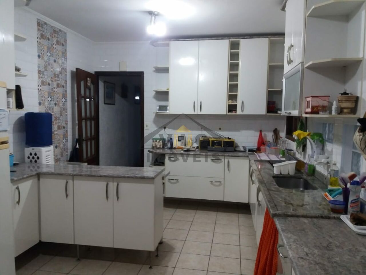 No nível seguinte encontram-se um terraço e o corredor lateral com churrasqueira e pia ao fundo na parte externa e, por dentro do imóvel, amplas sala e cozinha (repleta de armários), além de lavabo, lavanderia, quarto dos fundos e um banheiro (tudo na parte interna da casa).